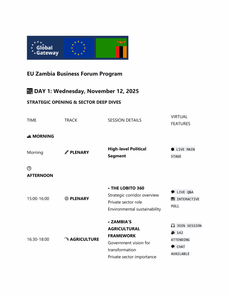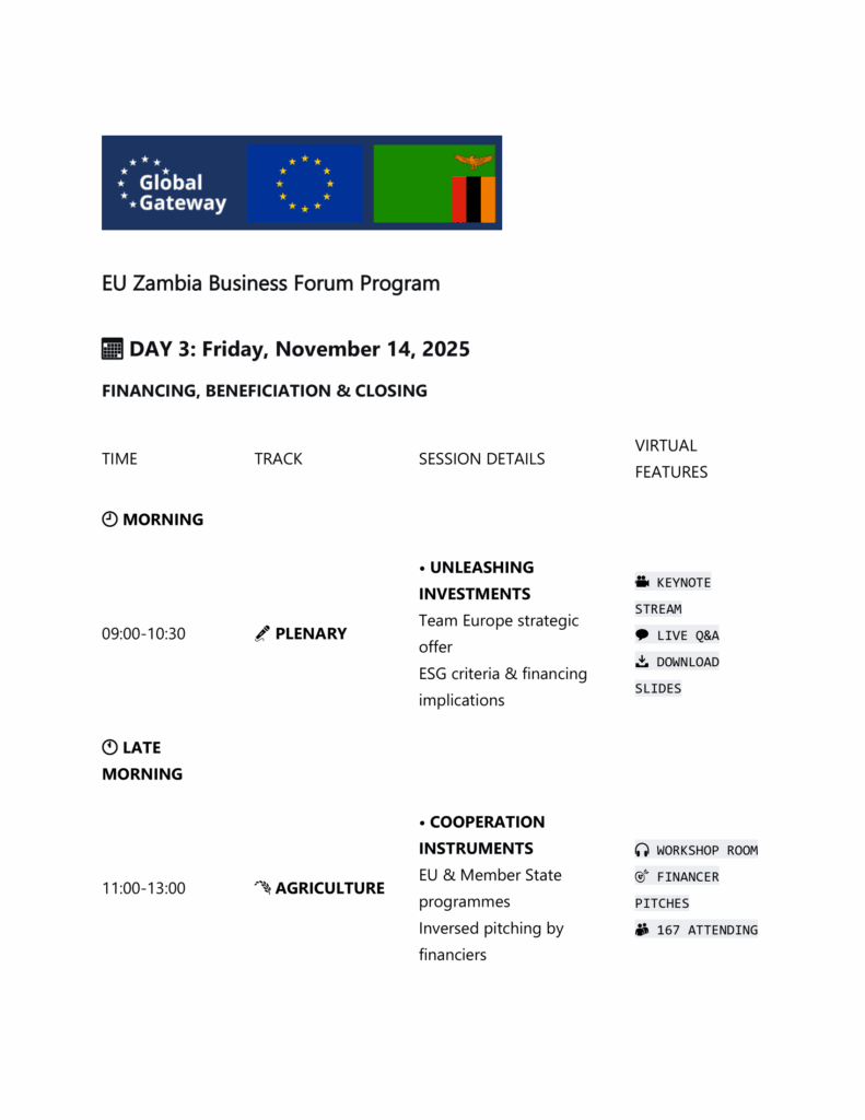 What to expect: Panel discussions on policy, project pitch sessions, and B2B meetings linking Zambian SMEs to European investors.