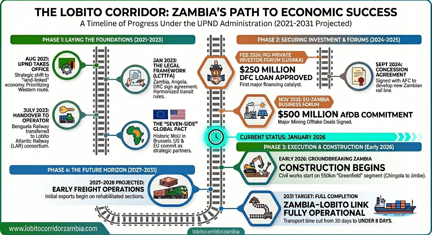 The Lobito Corridor is set to be a transformative economic engine for Zambia, primarily by providing a faster, more cost-effective gateway to international markets via the Atlantic Ocean. By connecting the mineral-rich Copperbelt and North-Western provinces directly to the Port of Lobito in Angola, the project is expected to slash freight transit times from over a month to just under a week and reduce copper export costs by as much as 30–40%. Beyond mining, the corridor will stimulate agricultural growth by opening new export routes for farmers and attracting investment into “agri-food” value chains like soybeans and horticulture. This massive infrastructure undertaking—backed by the US, EU, and African Development Bank—will not only create thousands of local jobs in construction and logistics but also modernize regional trade through improved digital connectivity, clean energy access, and more efficient border crossings, ultimately positioning Zambia as a central, competitive hub for Southern African trade.